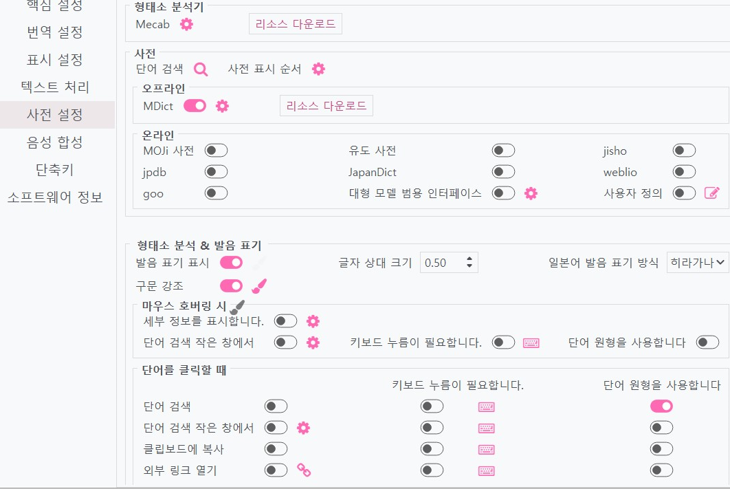 사전 설정에서 형태소 분석기, 사전을 리소스 다운로드합니다. 사용 켜주시고요