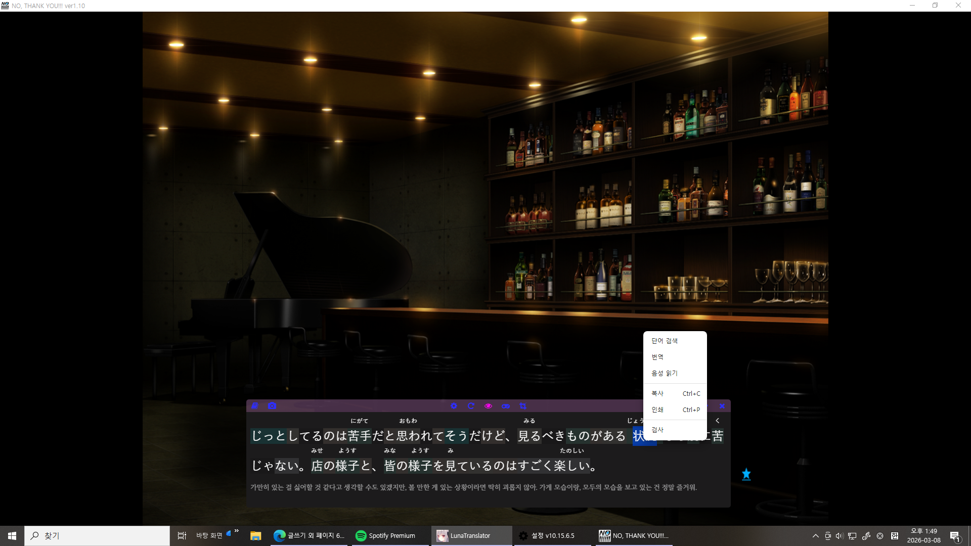 모르는 단어를 드래그>우클릭>단어 검색을 하면... (*저는 드래그해야 되도록 설정했는데 위 세팅탭에서 그냥 단어를 클릭할때>단어검색. 으로 설정하셔도 됩니다 그럼 단어누르자마자 바로 검색됨!!)